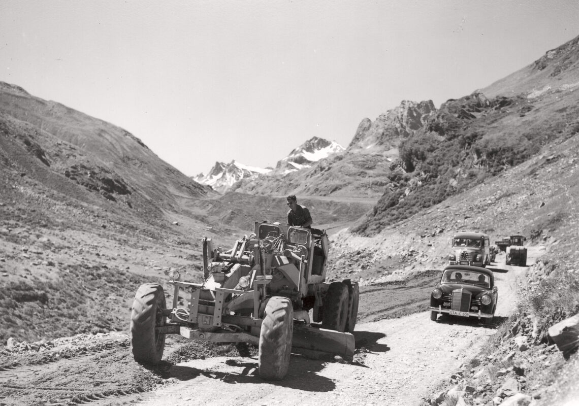 Der schwierigste Teil der Strecke zwischen Partenen und Vermunt fehlte noch bis 1951. Diese spektakuläre Straße wurde in umgekehrter Richtung mit einem riesigen Bagger, der zum Bau von Stauseen verwendet wurde, quer durch die steile Landschaft gebaut.