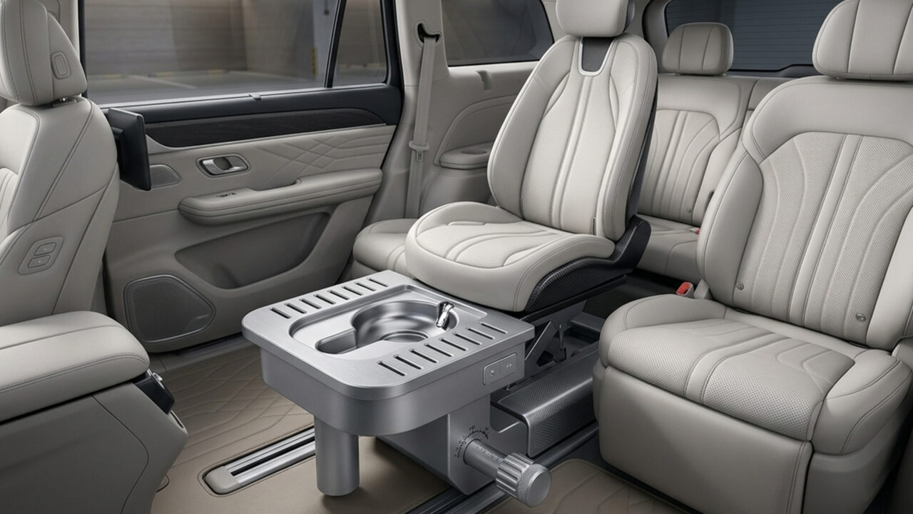 L’idée est aussi étrange qu’ingénieuse. Au lieu de trôner au milieu de votre habitacle, les toilettes sont cachées dans l’espace vide sous le siège du passager. Grâce à un ingénieux système de rails, les toilettes coulissent lorsque le besoin s’en fait sentir. Et comme nous vivons en 2026, cela ne se fait évidemment pas à l’aide d’un simple levier. Vous pouvez activer le système en appuyant sur un bouton ou – oui – par commande vocale. Une seule commande et votre trône apparaît.
