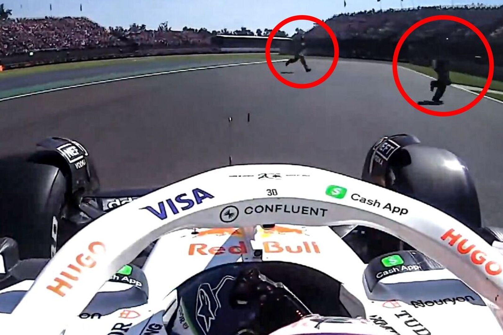 Lawson reageerde na de race nog altijd verbijsterd: “Ik kwam net op nieuwe banden de baan op en ineens renden er twee gasten over de baan. Ik heb dit nog nooit meegemaakt, het was echt levensgevaarlijk.”